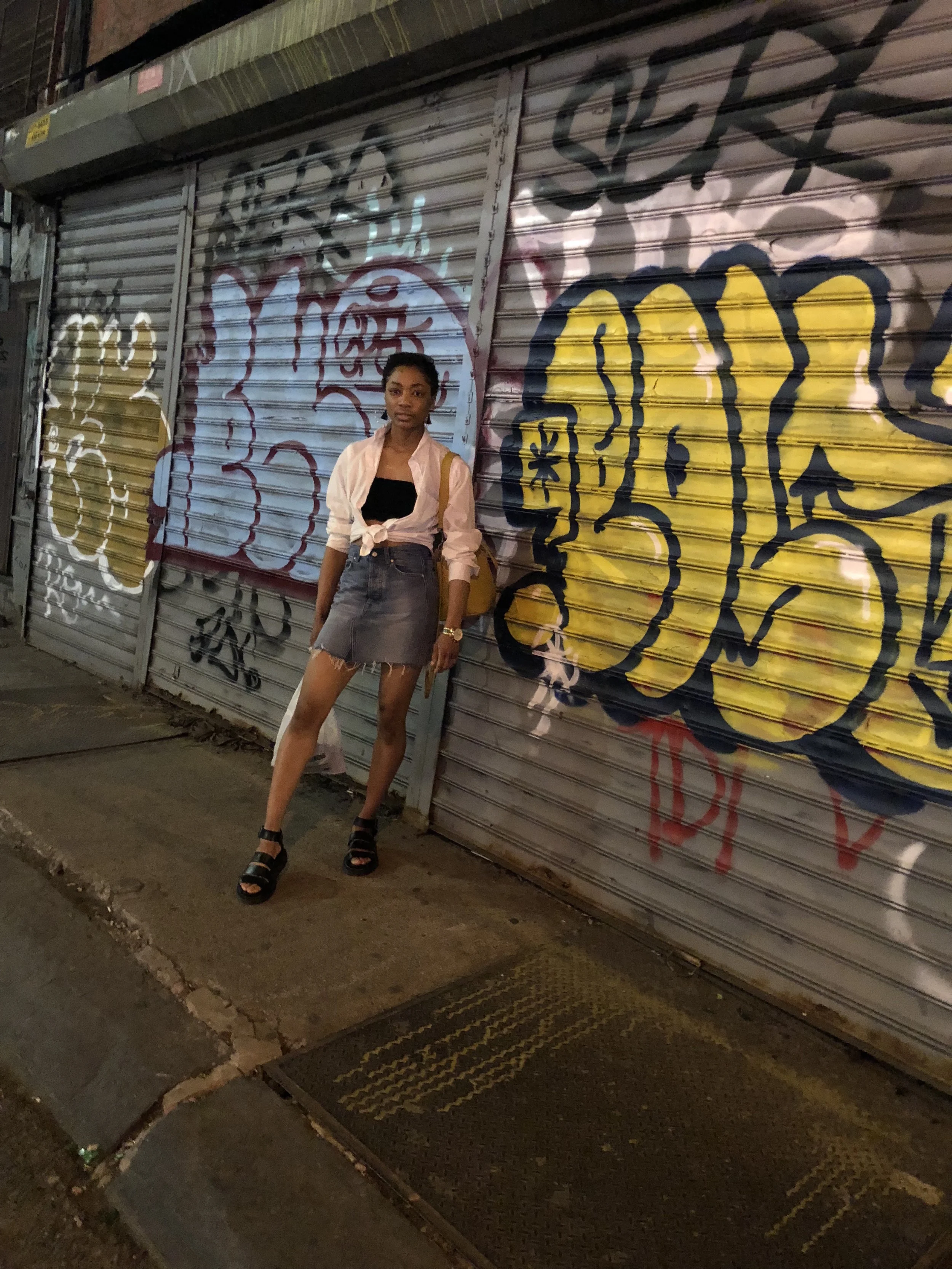 J.Crew Shirt | Brandy Melville Bandeau |H&M Demin Skirt |Doc Marten Sandals }|Matt & Nat Bucket Bag | Sunski Glasses