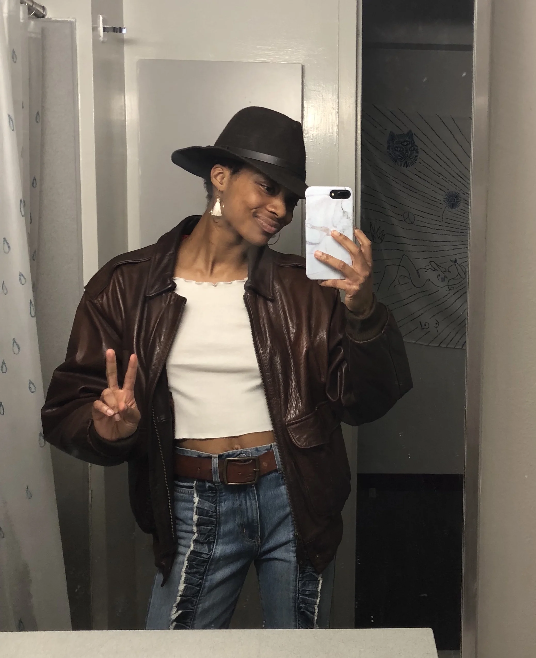 Banana Republic Vintage Leather Bomber Jacket | Brandy Melville Crop | Carmar Denim Jeans | Levi's Hat | J. Crew Tassel-Hoops | Vintage Leather Belt | UO Marble Phone Case