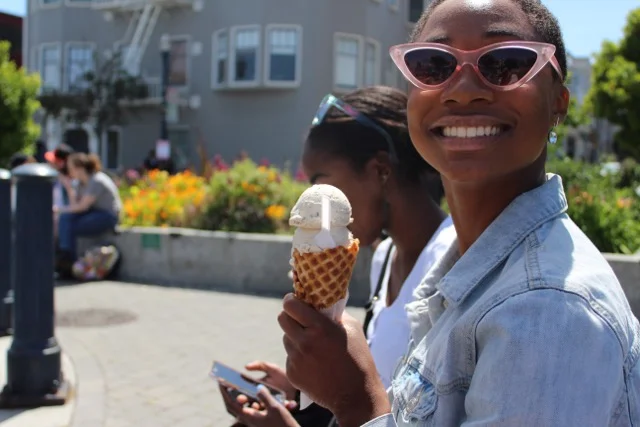 There's nothing like summer in the Bay Area. The chill and laid-back vibe of the West Coast is the perfect backdrop for a summer adventure. I am so excited to be back, dancing at Alonzo King Lines Ballet pre-professional program and to explore the beautiful city of San Francisco. Last weekend, a few friends and I spent the afternoon in Hayes Valley, strolling, eating and relaxing on benches in Patricia's Green. We spotted a cute, pink wall across the street and had an impromptu photo shoot. (Well, the photo shoot was totally planned but I promise, the wall was found spontaneously.)F 21 Tank| Abercombie Jeans | Air Force 1 Sneakers | Bershka Fanny Pack | Francesca's Sunglasses | Swarovski Earrings | UO NecklaceHayes Valley is the perfect place for a boujee, West Coast afternoon. From delicious pressed juices from Project Juice to artisanal baked goods from Boulangerie, there's a little something for everyone. I opted for an ice cream cone from Smitten.I got 3 scoops of their cookie dough with chocolate chips and pretzels in a waffle cone. Power moves only.Stay tuned for a post all about thrifting in San Fran. Also, huge thank you to my friend Maura for snapping these pics :)