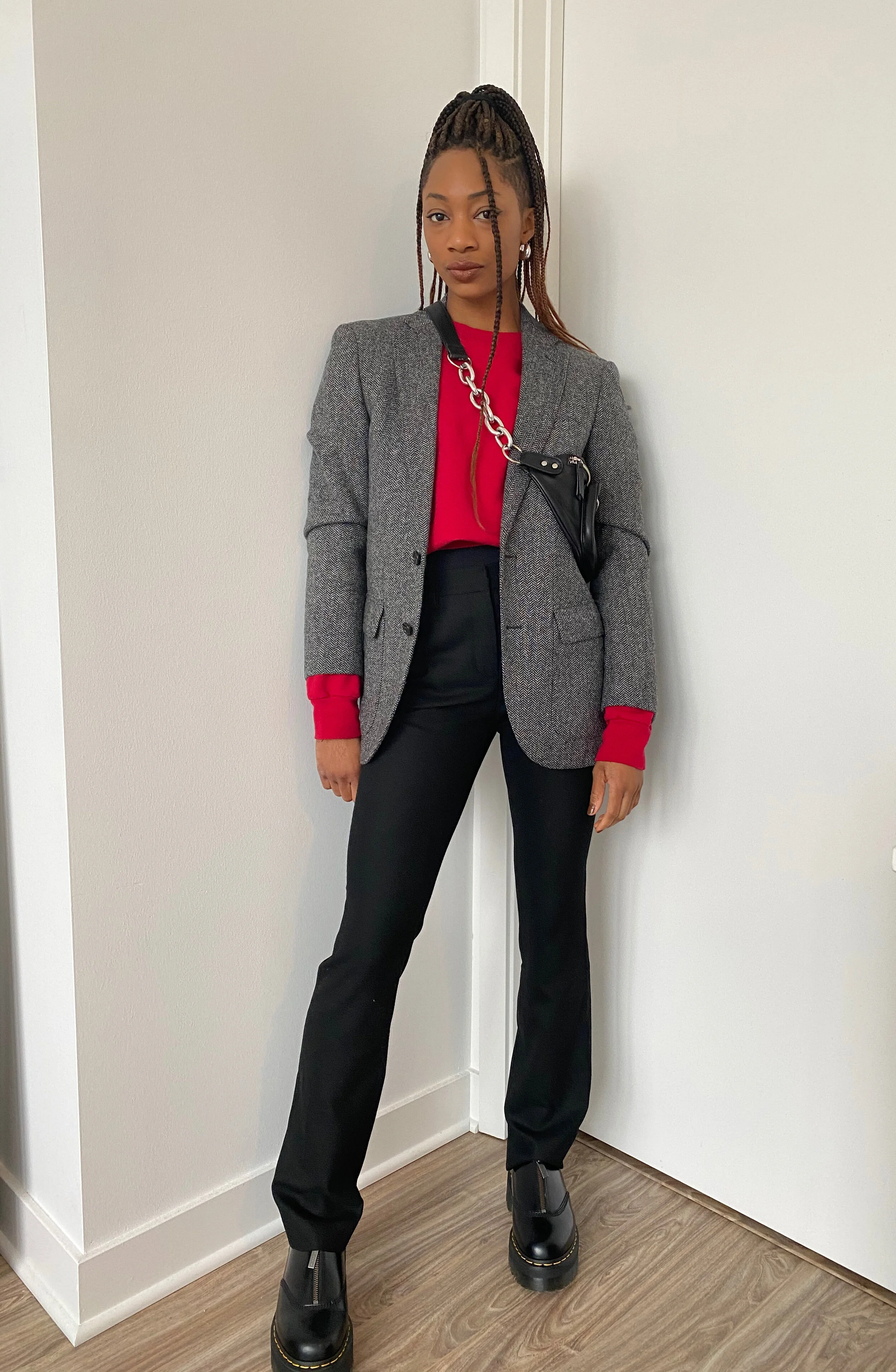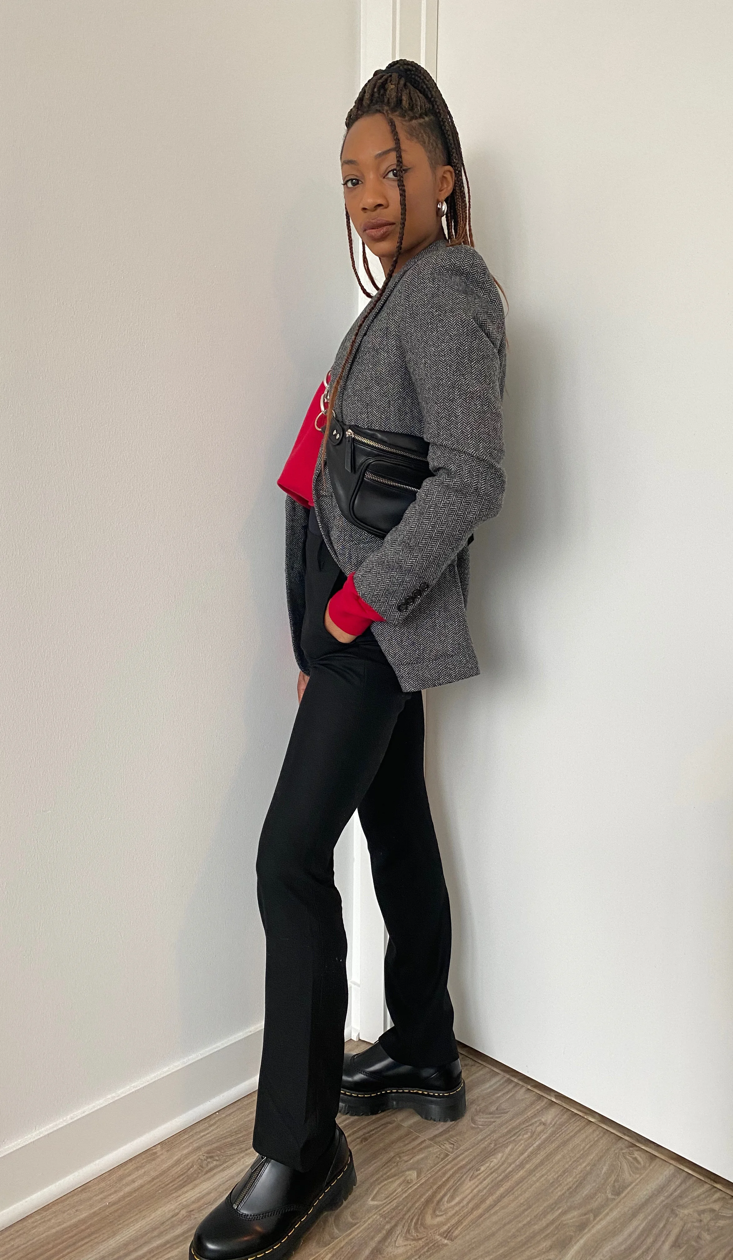 What I really dig about this look is how well the different fabrics complement each other. The Gildan sweatshirt provides the comfy, casual bit while the J. Crew wool blazer gives us some structure and pattern. Finally, these Reformation trousers fit just snug enough to be sassy but still somehow feel relaxed and effortless. I think we all know now that effortless is my all-time favorite outfit descriptor so if I use it, you know I’m feelin it.