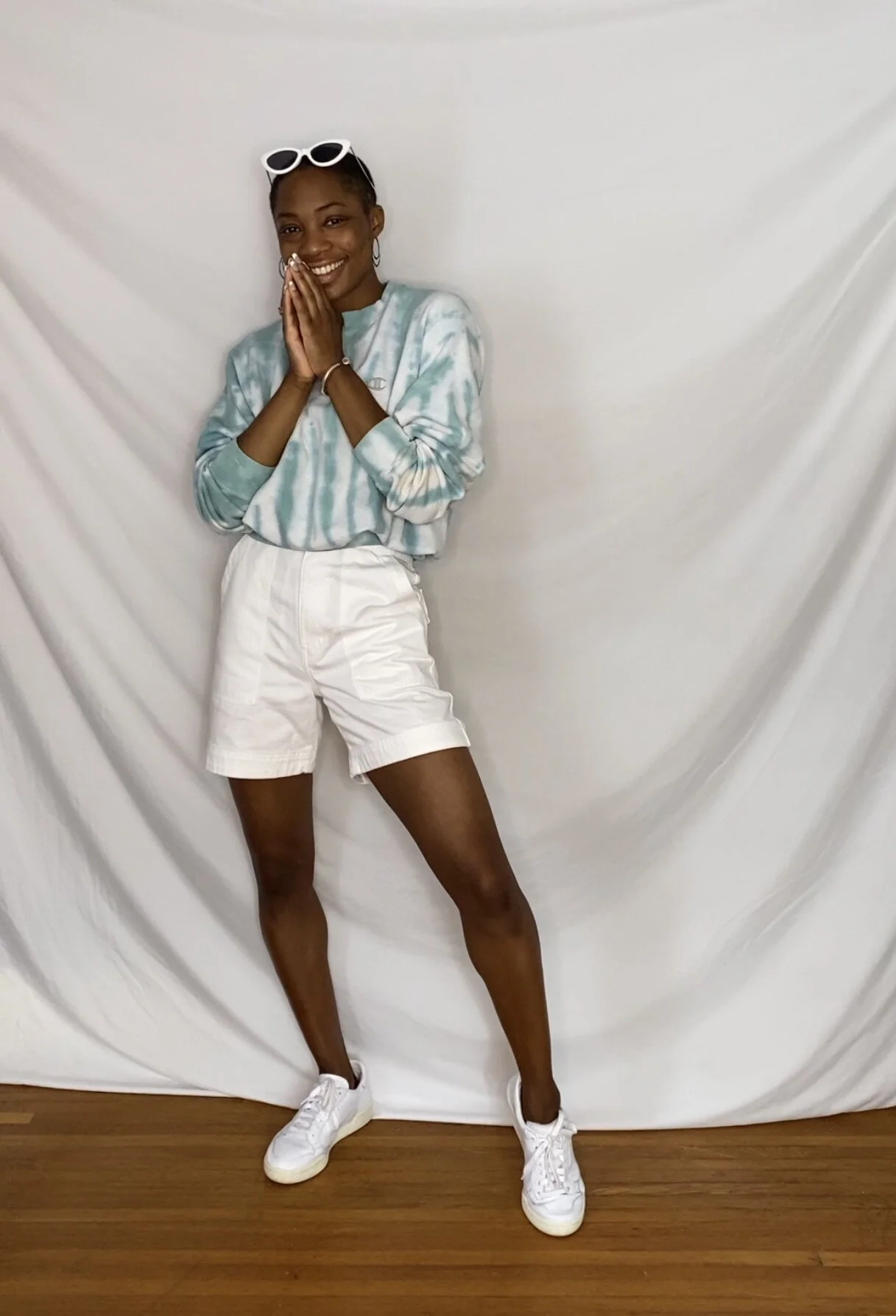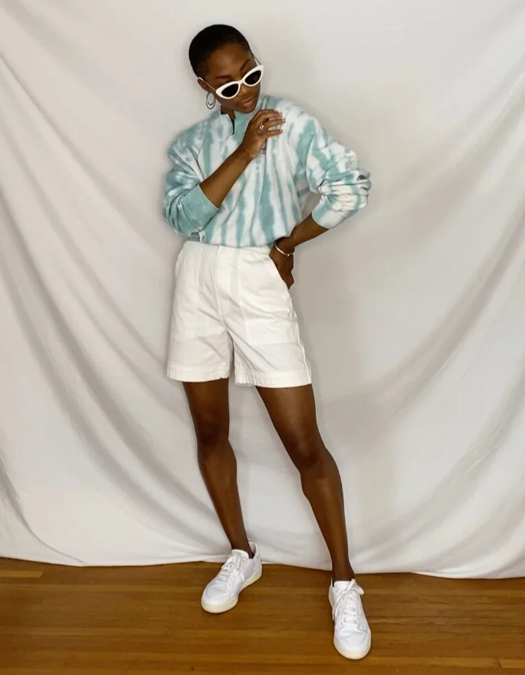 Whitley has a very preppy sense of style and wears a lot pastels. I decided to style a more sporty look that incorporates a trendy 90s silhouette with the high-waisted mom shorts and crewneck. To make the sweatshirt cropped, I cinched the bottom with an elastic hip-alignment belt (repurposing old ballet accessories is truly a great hobby), and tucked it underneath itself.
