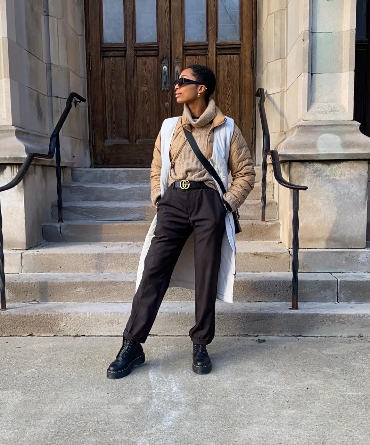 I anchored the look with my black Dr. Marten Sinclair boots, a RAINS crossbody bag and my Gucci belt. My everyday gold jewelry and the belt buckle add a much needed pop to this otherwise understated color scheme. When in doubt, gold jewelry always brings out a simple color scheme and makes a simple look feel more chic and timeless.