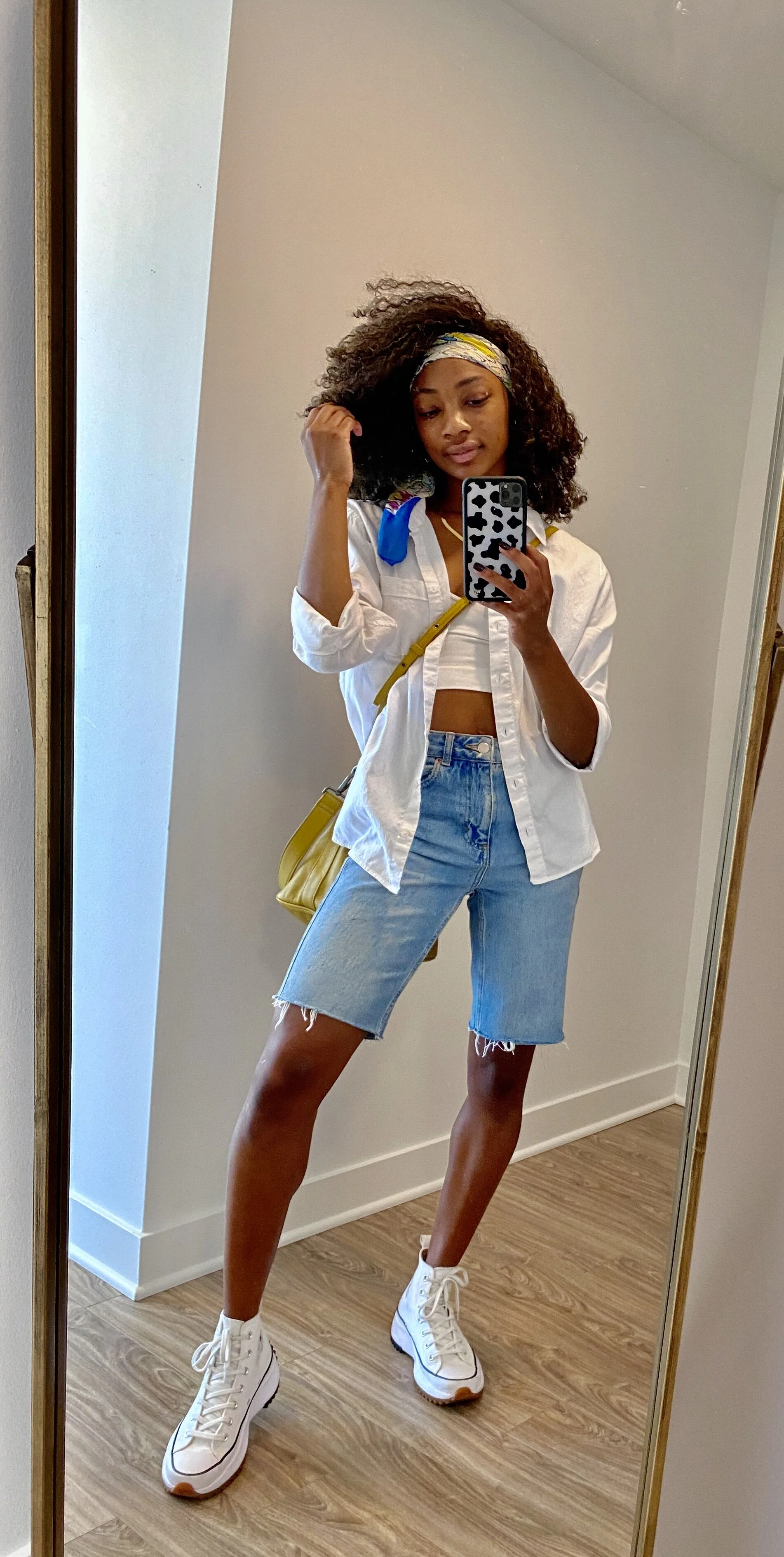 September 2nd at the New Apartment | Uniqlo Linen Shirt, Agolde Denim Shorts, Converse Run Star Hike Sneakers, Brandy Melville Tank, Madewell Leather Tote