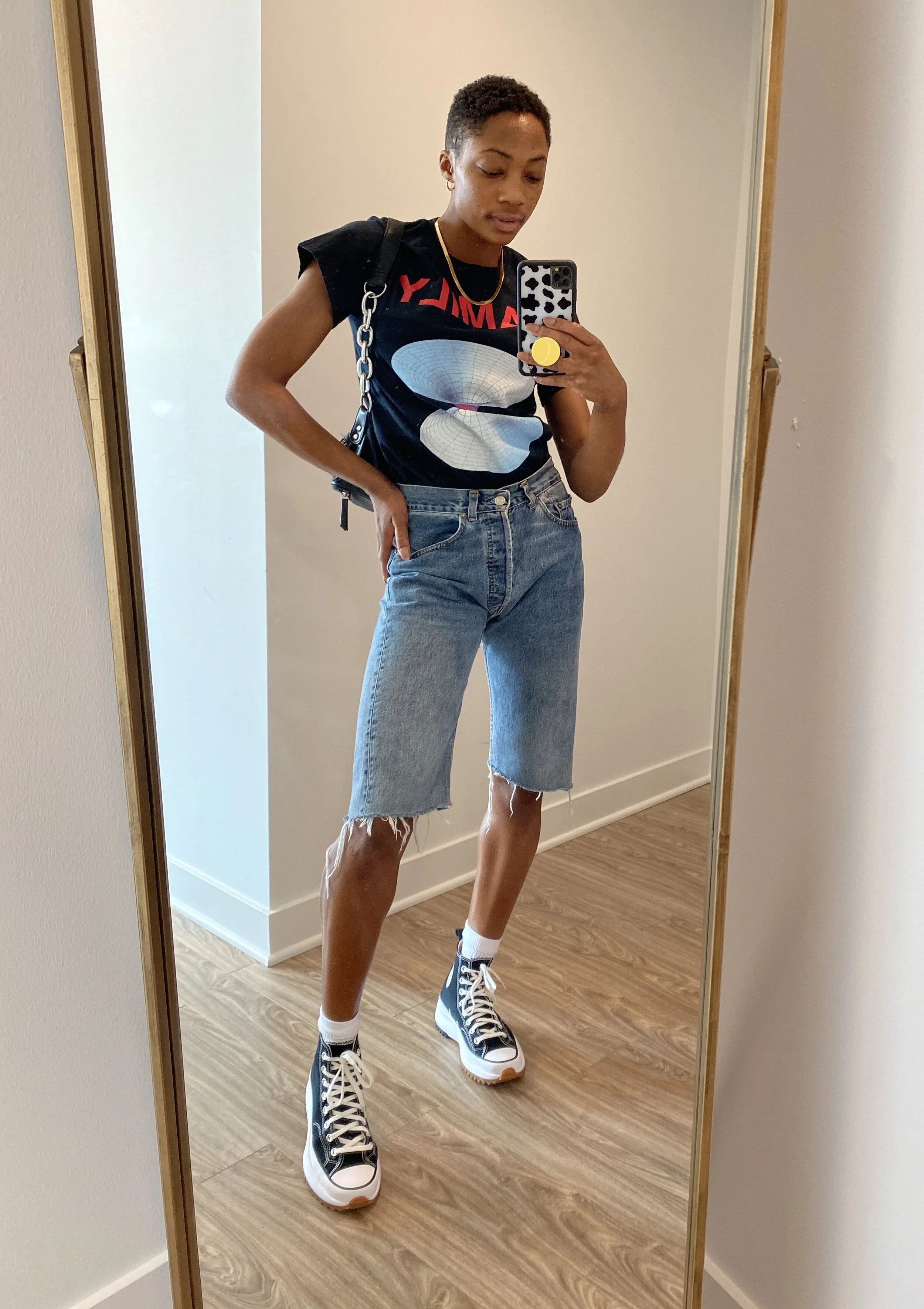 september 14th | vintage levi’s denim shorts, thrifted msfts rep t-shirt, chain form half & half boutique, nike run star hike sneakers, bershka collection crossbody chain bag