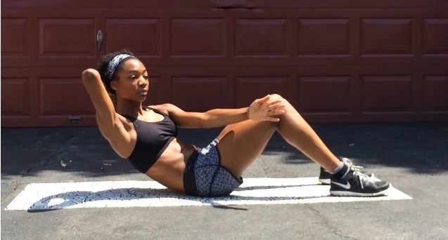 For this one, you're going to come up to sitting and balance on your tailbone with your legs bent and feet off the mat. In one count, you're going to extend your arms and legs as if you were going to lie flat with your arms above your head on the ground. But you are not going to touch the ground! You're going to use your core to balance yourself in this laid out position and bring yourself back to the legs bent position, still on balance. A little confusing, I know, but look at the pictures to help you. Repeat this for 2 counts of 8 and try to stay balanced for the entire set. Push girl, push!!!