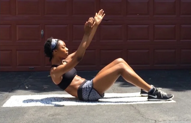 This is probably my favorite just because of the name. It's pretty great, right? So you're going to continue the Russian twists while lowering your body down to hover above the mat in four counts and bring yourself back up to sitting in four more counts. You're arms should be lifted above your head, parallel to each other as you do this. Confused yet? Look at the picture below to see what I'm talking about. Got it? Continue this one for 4 sets of 8.